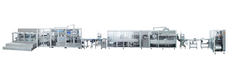 該高速自動生產線,由高速雙列四邊封包裝機+電子稱+高速全自動裝盒機+電子稱+透明膜三維裹包機組成,結構合理、操作簡單、提高生產效率和產品合格率,降低工人勞動強度和生產成本,可與捆扎、裝箱機、碼垛等設備連線配套。